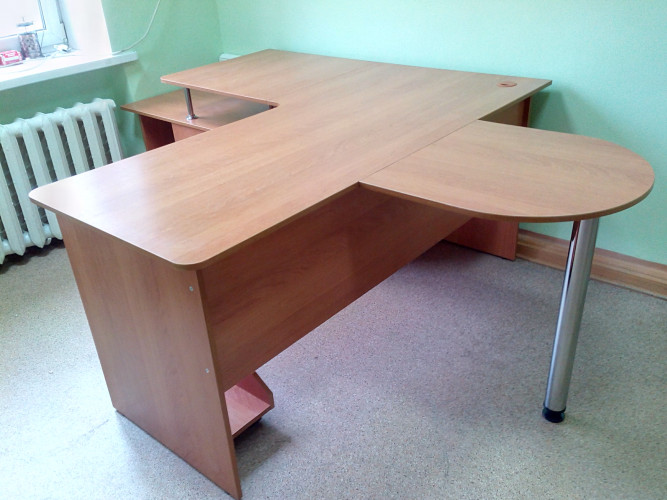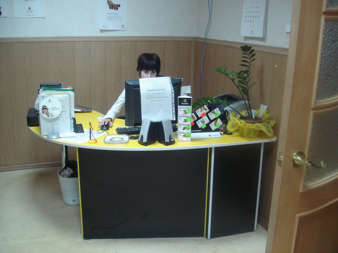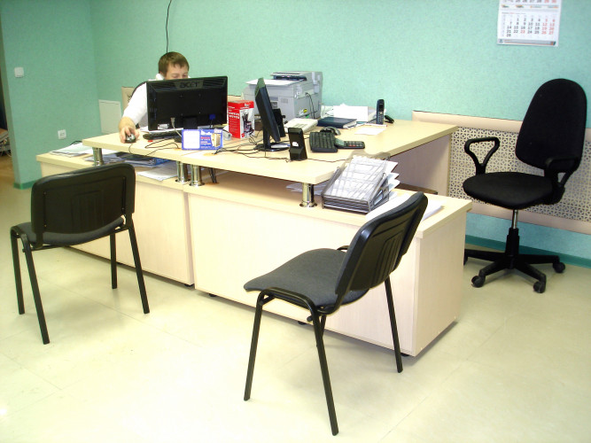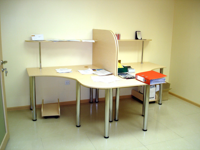 Для персонала — функциональная, компактная и более дешевая. Отличается эргономичным дизайном и лаконичностью. Для изготовления используются плиты ДСП, МДФ, стекло, металл, другие современные материалы.