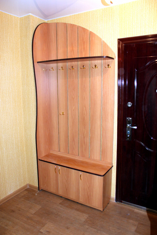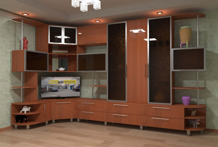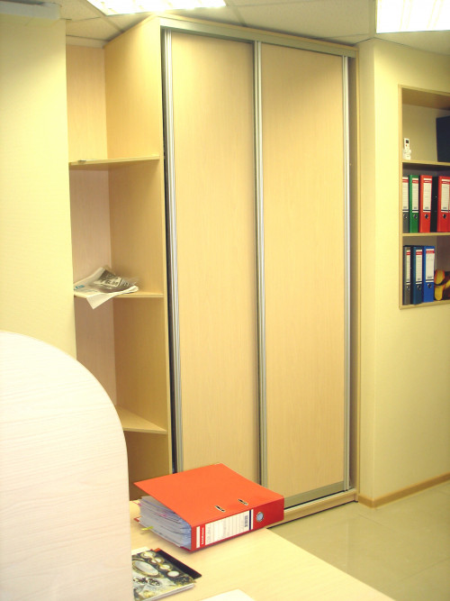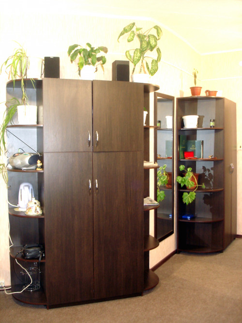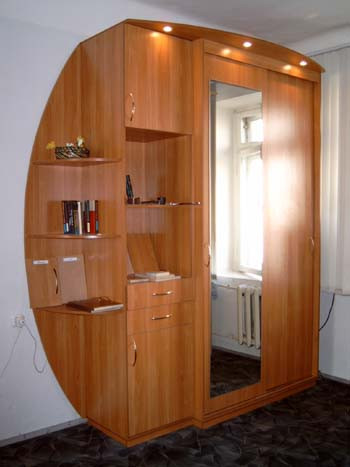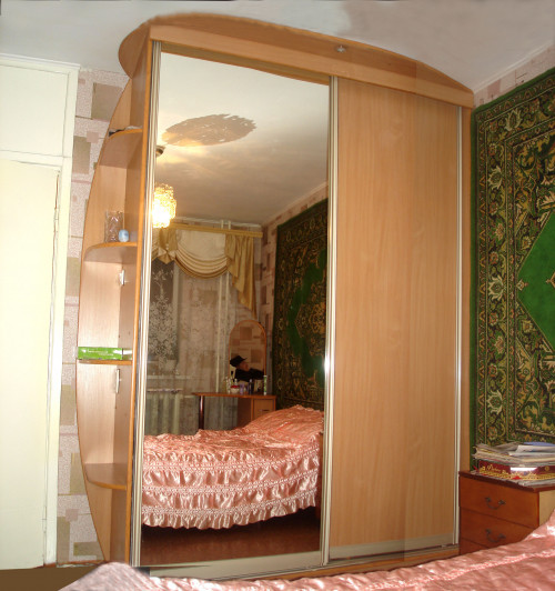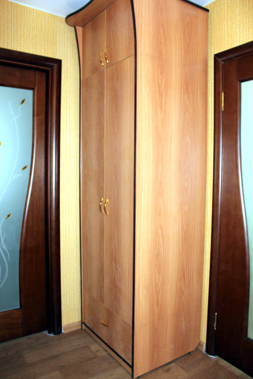 Достоинство таких шкафов – это возможность установки в небольшое пространство, куда невозможно вписать иной предмет мебели. Недостаток заключается в сложной форме, требующей дополнительных затрат при изготовлении.